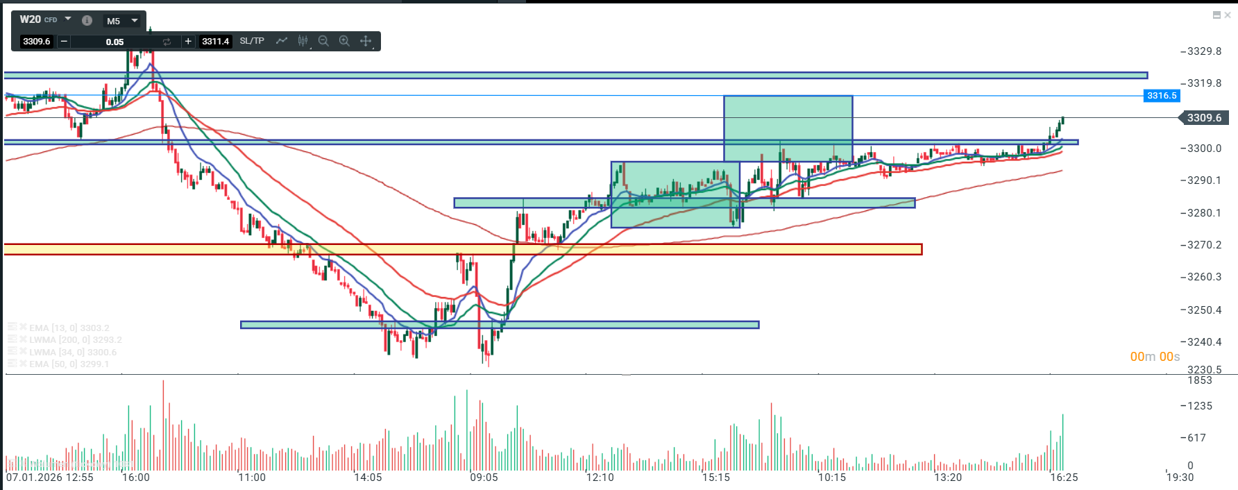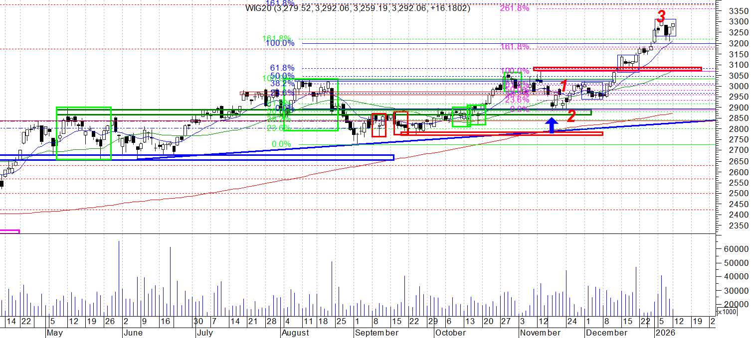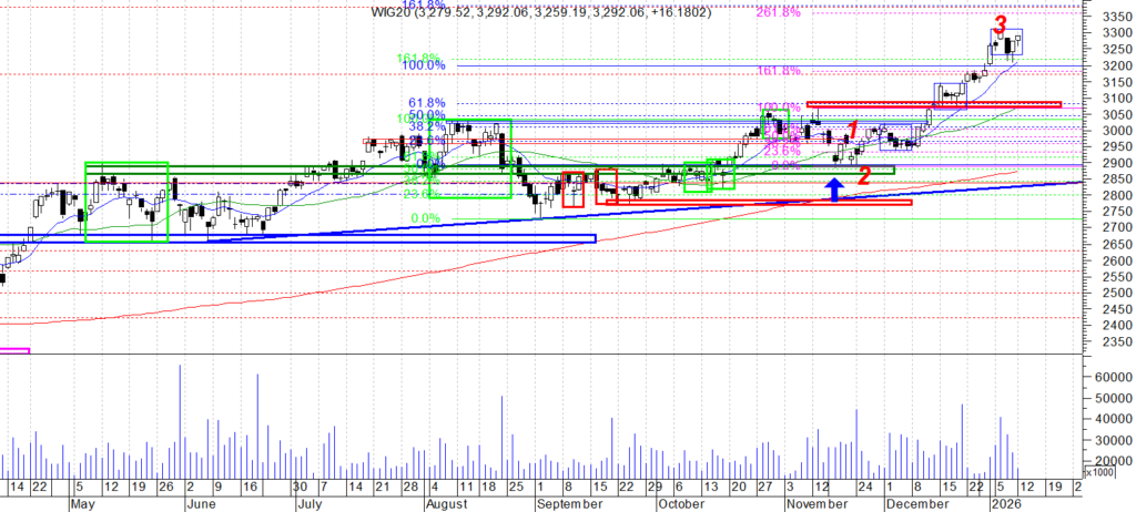 Na wykresie intra kontraktów na WIG 20 mamy trend wzrostowy , który wybił strefę oporu na ok. 3300 i tym samym wskazał drogę na 3320. Oczywiście podstawowe założenie to nowy szczyt ale wspomniana okolica 3320 ma dużą szansę wywołać korektę, no chyba że ….. Taka korekta zacznie się nieco niżej tzn. na poziomie na którym idealnie wpasowałaby się w układ 1:1 (niebieska linia z oznacznikiem poziomu).