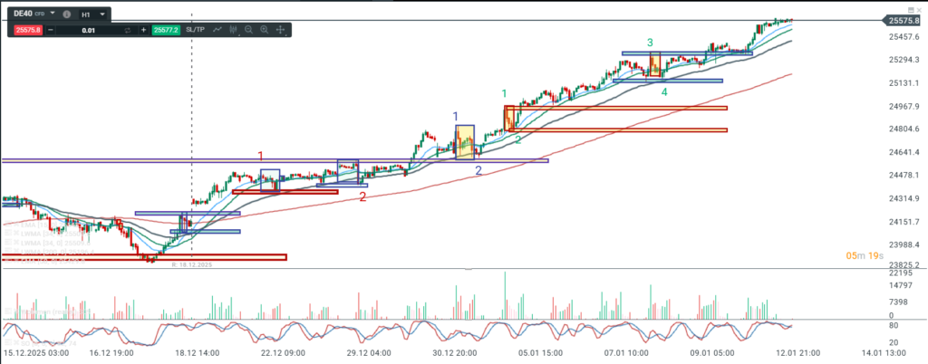 Na wykresie intra kontraktów na DAX mamy cały czas silny trend wzrostowy a oznaczenia jakie naniosłem wskazują i dają jakby potwierdzenie do tego, że jesteśmy tu w dużej fali 3 a dokładniej 5 w 3 w 3.