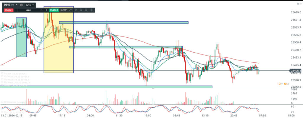 Na wykresie intra kontraktów na DAX widać gołym okiem że od szczytu rynek zszedł zwykła „trójką” co jednak daje możliwość podążania teraz na szczyt. Od dołka dotychczasowej korekty mieliśmy moim zdaniem impuls a po nim mamy rozciągniętą w czasie korektę. Innymi słowy stawiam na scenariusz w którym jeszcze podczas dzisiejszych notowań rynek DAX będzie miał swój ruch w górę. Tu należałoby mimo wszystko zakładać nowy szczyt ale ze względu na to co pisałem przy okazji wykresu dziennego, zachowałbym szczególna ostrożność w rejonie zielonej, najwyżej położonej na wykresie, strefy oporu. Zmiana spojrzenia nastąpi w przypadku wybicia widocznych minimów.