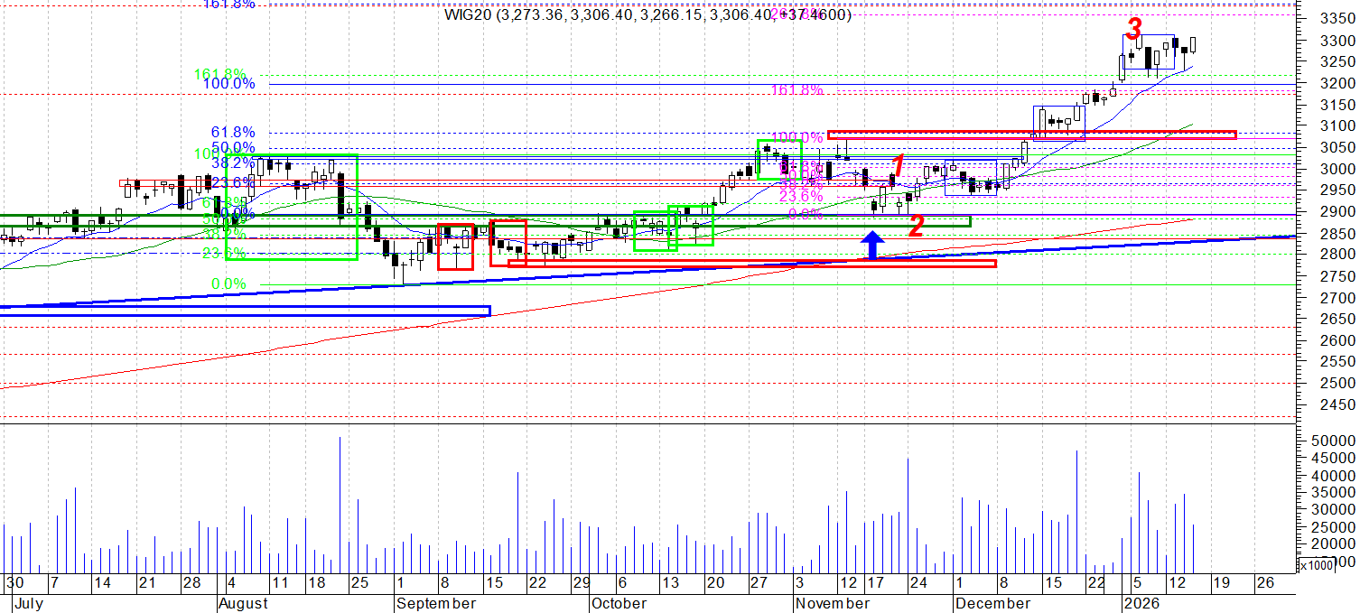 Na wykresie dziennym indeksu WIG 20 mamy wzrostową świece po korekcie wyrysowanej za pomocą dwóch spadkowych z dolnym cieniem. Trudno jest ocenić to inaczej niż realizacja scenariusza z nowym szczytem hossy, Jedyny problem jaki dostrzegam to w ocenie czy mamy 4 płaską czy może mamy 1,2 i wchodzimy w 3 po korekcie prostej. Jednak to co najistotniejsze to realizacja podstawowego scenariusza.