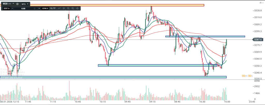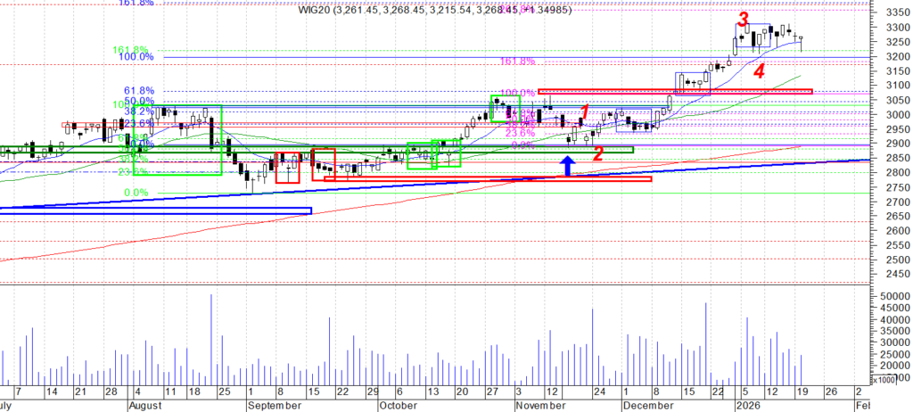 Na wykresie intra kontraktów na WIG 20 mamy swingową trojkę w dół od szczytu i odbicie od strefy wsparcia. Na ten moment od dołka mamy trójkę niższego rzędu i brak wybicia strefy oporu czyli ostatniego potwierdzonego szczytu. Z drugiej strony zakres OB wyraźnie pokonany. Wniosek – duże prawdopodobieństwo kontynuacji wzrostu. Gdyby jednak cena nie poszła nad strefę oporu a zawróciła z obecnych okolic to dalej w grze S. Na ten moment tak naprawdę dopiero wybicie w dół ok. 3240 (a to dość daleko) potwierdziłoby kontynuacje spadku w ujęciu swingowym.