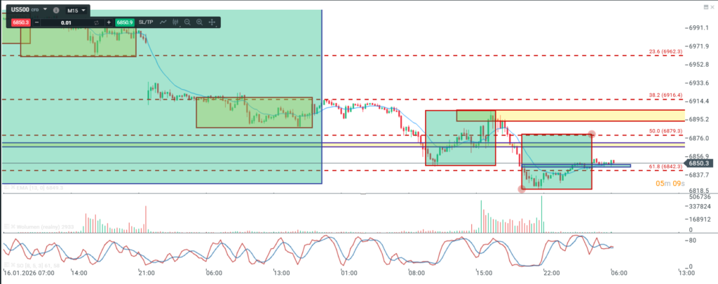 Na wykresie intra kontraktów na DAX mamy zejście do strefy wsparcia połączonej z geometrią 38.2 i odbicie. Jednak na ten moment odbicie wpisuje się tylko w korektę po której można oczekiwać następnego dołka. Szansa byków na większy ruch w górę powstała by gdyby cena wybiła obecna strefę oporu a następnie po jej re-teście od góry ponownie ruszyła na północ.