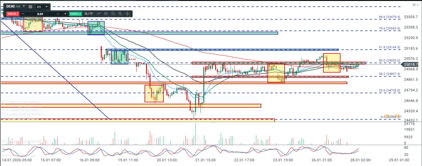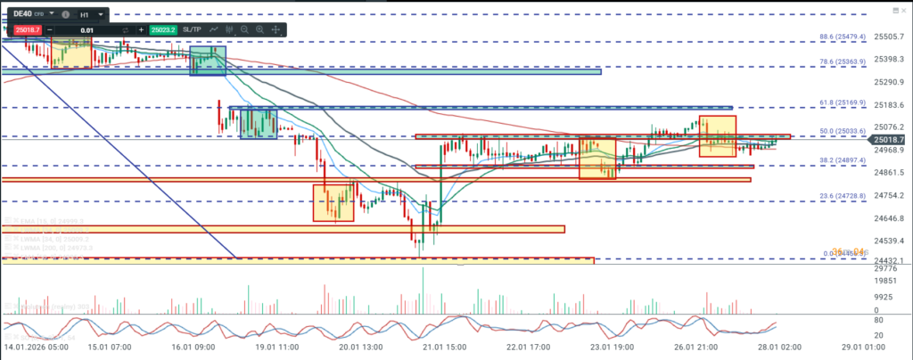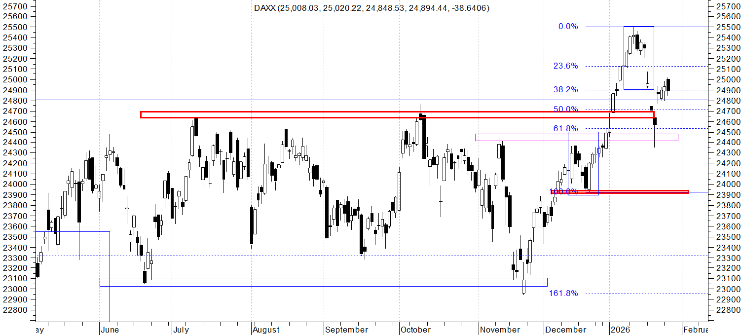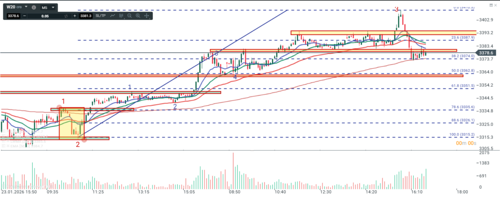 Na wykresie intra kontraktów na DAX mamy teoretyczny układ 1:1 jednak to co jest między korektami bardziej przypomina impuls niż „trójkę” i dlatego mimo wszystko zakładam że 1:1 nie zostanie zrealizowane a widoczna strefa oporu ma duże szanse aby spowodować spadek. Zanegowanie 1:1 to wskazanie na zejście chociażby do poziomu pierwszego swingowego szczytu po odbiciu od dołka tj do okolic 24740. Muszę też wspomnieć o tym, że od dołka , moim zdaniem mamy impuls i dlatego w podstawowym scenariuszu zakładam ruch w dół w ramach korekty do wspomnianych okolic. Gdyby jednak zrealizowany został układ 1:1 to wybicie ostatniego szczytu w takim układzie byłoby swingowym sygnałem kupna z wskazaniem na okolice 25360.