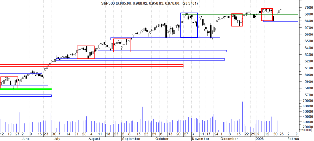 Na wykresie dziennym indeksu S&P mamy małą wzrostową świecę z maksimum o 2 pkt wyższym niż poprzedni szczyt trendu. Tym samym minimalny wynik korekty 1:1 został osiągnięty i w przypadku rysowania klina moglibyśmy być już gdzieś przy końcu wzrostu. Osobiście jednak, ze względu na trend, zakładam że możemy mieć teraz jakąś korektę jako po której dojdzie do zdecydowanego wyjścia na wyższy szczyt, jeśli w ogóle taka korekta będzie miała miejsce.