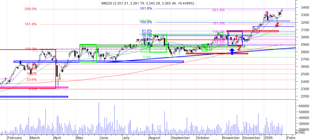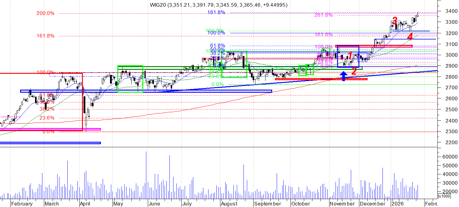 Na wykresie dziennym indeksu WIG 20 wyrysował się Pin bar z wzrostowym korpusem i dużo większym cieniem od góry. Cień to reakcja na wskazywana dużo wcześniej strefę silnego zgrupowania zniesień połączonych z górnym ograniczeniem kanału z wykresu tygodniowego. Mamy zatem reakcję i jakieś ostrzeżenie. Czy jednak można tu mówić o wyczerpaniu wzrostu? Moim zdaniem nie , to po prostu zbyt mało, zwłaszcza gdy spojrzy się na wykresy tej części spółek które mają największy udział w indeksie.