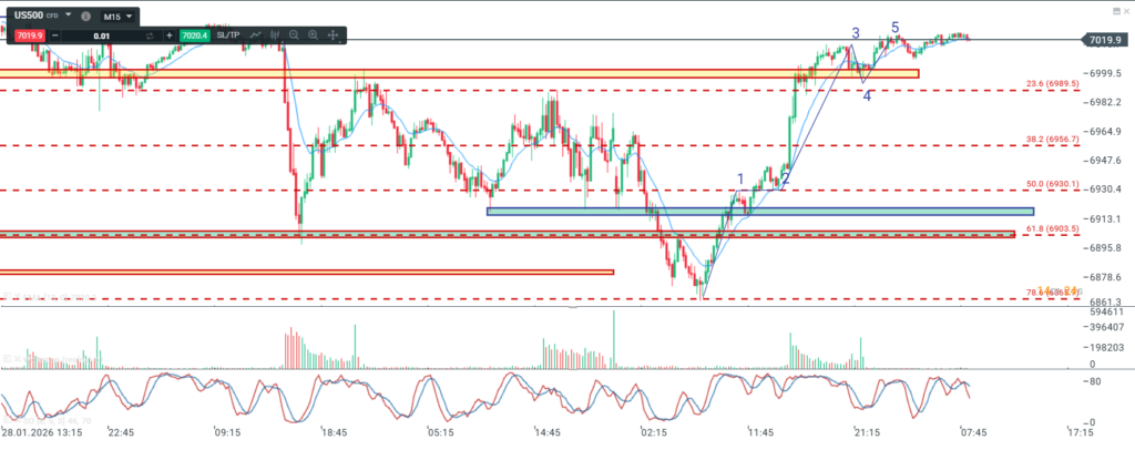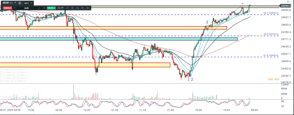 Na wykresie intra kontraktów na DAX mamy silny i dynamiczny ruch w górę , który moim zdaniem powoli wypełnia znamiona impulsu. To co najistotniejsze dla mnie to wybicie ostatniego potwierdzonego szczytu i tym samym danie mocnej okazji do rozwijania impulsu wyższego rzędu z celem na nowym szczycie.