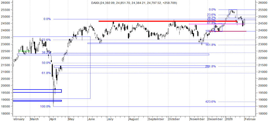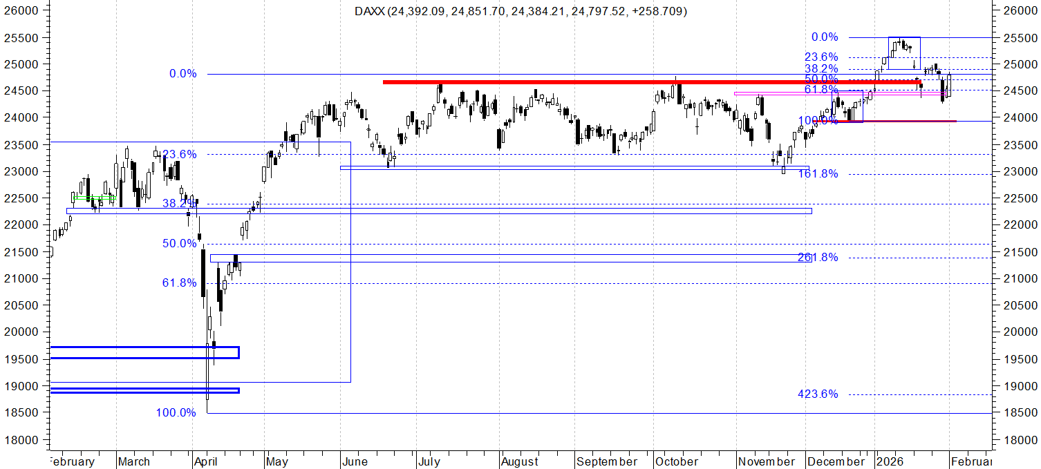 Na wykresie dziennym indeksu DAX powstała solidna wzrostowa świeca , która z poprzednimi dwoma ustanowiła formację Gwiazdy porannej na strefie wsparcia. Mamy zatem przygotowanie do ruchu w górę który powinien wyjść na nowy szczyt. Złamanie wspomnianej formacji zmieni spojrzenie na ten rynek.