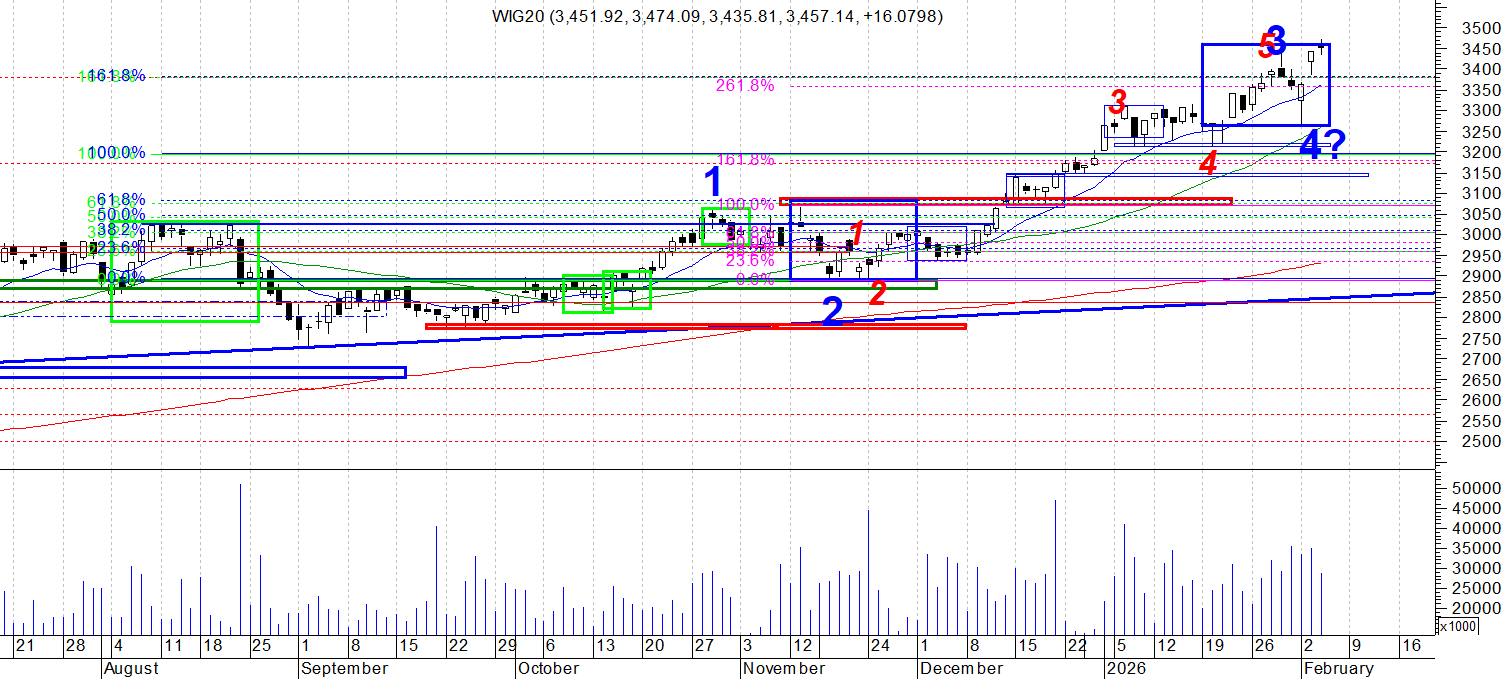 Mała wzrostowa szpulka i nowy szczyt to efekt wczorajszej sesji na indeksie WIG 20. Tym samym bardzo wzrosło ryzyko odwrócenie , bo jak dokładnie widać, mamy już pełną 5-kę (niebieską). Oczywiście nie jest to stanowczy dowód świadczący o zakończeniu wzrostu, tu może być kontynuacja (chociaż intra zdaje się dawać mocniejsze oznaki końca). Jedno co spędza mi sen z powiek to kwestia , czego możemy oczekiwać teraz. Czy tylko korekta w ramach impulsu wyższego rzędu czyli jakieś 300 pkt czy jednak znacznie mocniejsza zmiana? No ale na to pytanie jeszcze odpowiedzi nie znam nawet w najmniejszym stopniu. Tak jak napisałem wcześniej, ryzyko odwrócenia obecnej tendencji wzrostowej drastycznie wzrosło co widać na przykładzie wykresu intra.