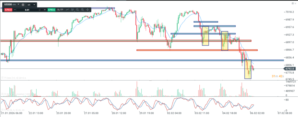 Na wykresie intra kontraktów na S&P mamy trend spadkowy. Obecnie zakładam że jesteśmy w fali 4 impulsu zapoczątkowanego po korekcie pędzącej 1:1. Patrząc od szczytu mamy zatem 1/a , 2/b i ….. no właśnie. Tu powiedziałbym tak. Po pierwszej, największej jak dotąd korekcie od szczytu mamy 1 wspomnianą korektę pędzącą jako 2 i teraz jesteśmy w trzeciej. Ciekawym miejscem do zakończenia obecnego odbicia jest oczywiście zasięg OB pokrywający się z strefą cenową o dłuższym zasięgu czasowym. Jednak to co najistotniejsze, jeśli rozgrywany jest tu pełen impuls od szczytu to przed nami jeszcze spadek co najmniej do okolic 6700 i to tylko w wspominanej fali 3. Złamanie scenariusza to moim zdaniem pokonanie czerwonej strefy oporu.