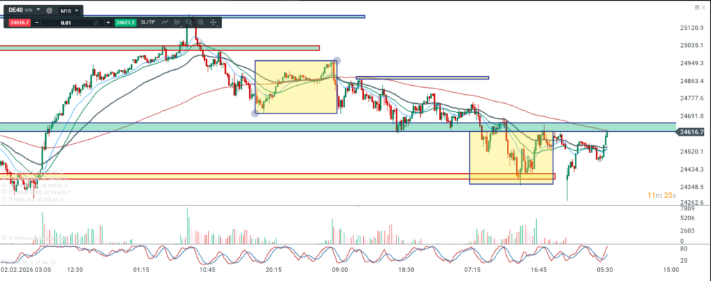 Na wykresie intra kontraktów na DAX mamy trend spadkowy który w drodze przebył dwie równe największe korekty co mogłoby wskazywać, iż ostatni dołek to koniec impulsu choć mam do tego spore obawy. Zatem obecne odbicie może tworzyć korektę spadku choć jej ewentualny zasięg , moim zdaniem to co najwyżej tuż nad strefą oporu na poziomie dwóch dołków wypadających na dolnym zakresie pierwszego OB. Pytanie brzmi, czy w ogóle rynek da radę choć trochę naruszyć obecną strefę oporu, bo jeśli nie to moje obawy wypowiedziane wcześniej dostaną wskazanie na realne i będziemy rozpatrywać kwestię rozbijania fal.