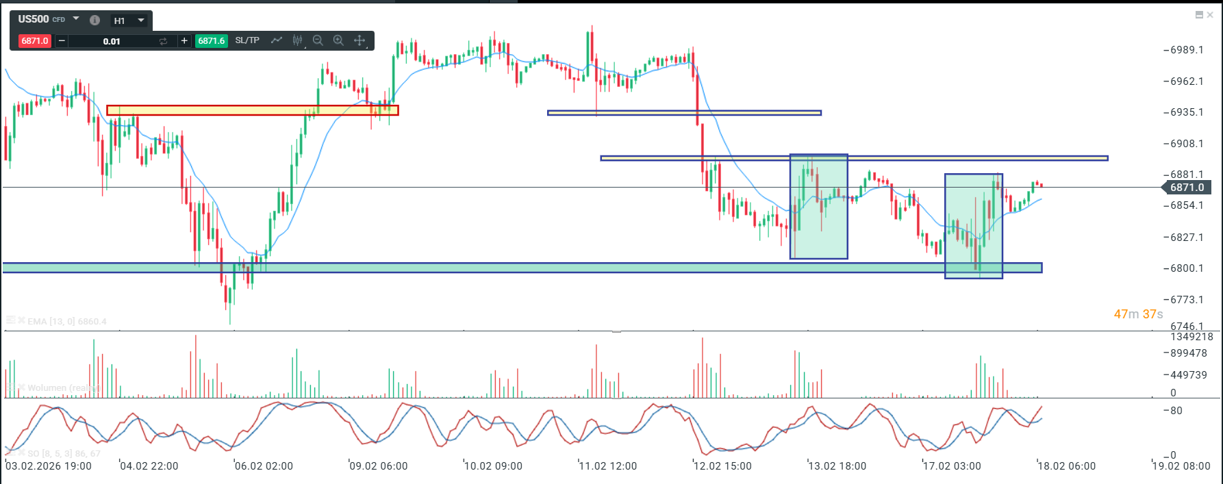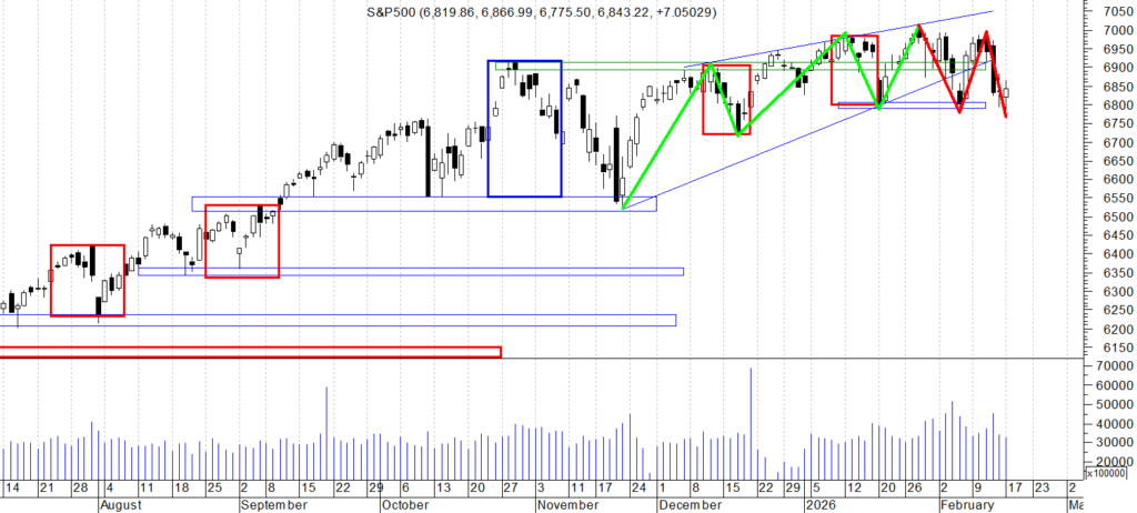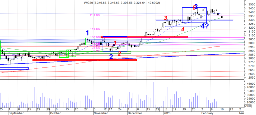 Na wykresie dziennym indeksu S&P wyrysowała się szpulka wzrostowa z wyraźnie wyższym dolnym cieniem, który to osiągnął nowe minimum w spadku. pozwoliłem sobie narysować tu kolorowe linie aby łatwiej przedstawić trudność obecnej sytuacji. Zielone linie wskazują na trzy kolejne szczyty po większej korekcie (niebieskie OB). Patrząc całościowo na wykres, tzn. od dołka z kwietnia 2025, już jakiś czas temu założyłem że niebieski OB może być falą 4. Idąc dalej tym tropem wyrysowane zielone linie mogą wskazywać na ukończenie klina wzrostowego w fali 5. Jednak na ten moment mamy tylko i wyłącznie 3 czerwone linie co oznacza że od szczytu mamy korektę a to każe brać również pod uwagę scenariusz w którym zakres trzech zielonych linii daje nam trójkąt początkowy w większej fali 5 od dołka z kwietnia 2025. Inaczej rzecz ujmując , trzeba brać pod uwagę również scenariusz gdzie po niebieskim OB mamy falę 1 jako trójkąt początkowy, jesteśmy w fali 2 po której przyjdzie czas na silna falę 3 wzrostową. Ja na pewno nie potrafię bardziej znacząco wskazać w tym momencie, który scenariusz budujemy.