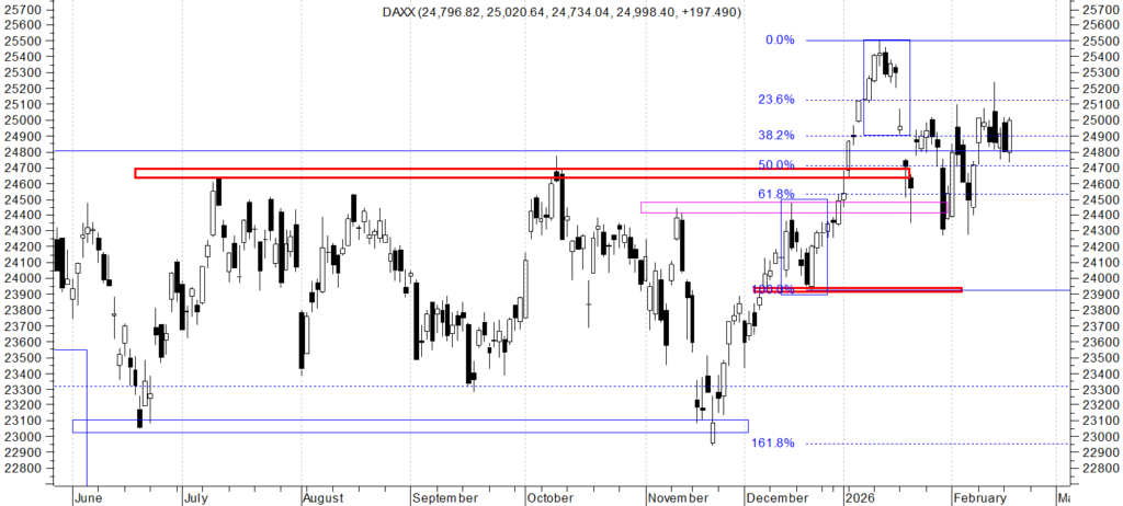 Na wykresie dziennym indeksu DAX wyrysowała się wczoraj, sporych rozmiarów, świeca wzrostowa. To na co chciałbym zwrócić szczególna uwagę to fakt iż jej minimum wypadło poniżej minimów dwóch poprzednich sesji co można przełożyć na wyrysowanie układu abc od szczytu swingu wzrostowego. Innymi słowy, mamy układ który mógłby doprowadzić do wybicia szczytu i mocniejszego wejścia w kolejny swing wzrostowy. Złamanie DB jakie powstało na bazie trzech ostatnich sesji to wskazanie na kontynuację ruchu w dół i zagrożenia wybicia strefy dołków na poziomie ok. 24250.