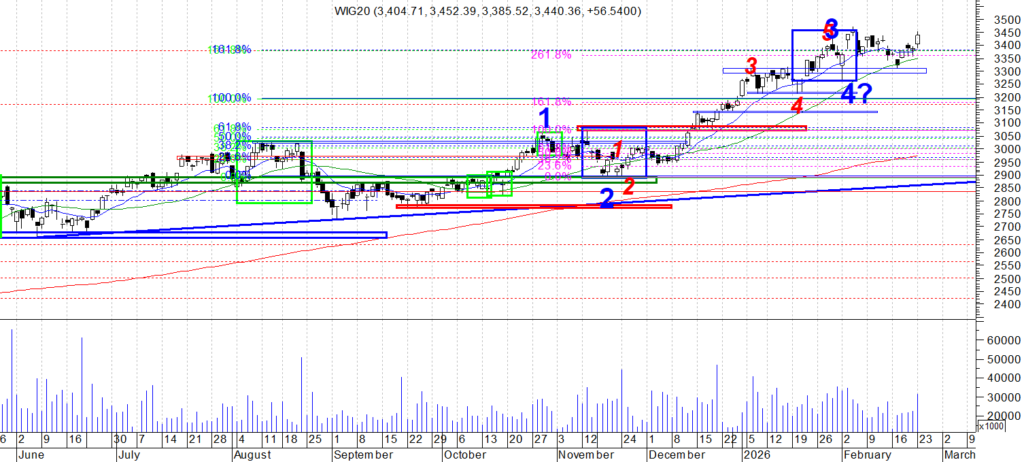 Na wykresie dziennym indeksu WIG 20 powstała wzrostowa świeca z małymi cieniami po obu stronach. Można powiedzieć że scenariusz z nowym szczytem w tle porusza się na przód ale . No właśnie , jest „ale”. Chodzi tu o dwie kwestie. Pierwsza to strefa OLO a druga to skokowy wzrost obrotu. To niesie za sobą niebezpieczeństwo wyrysowania tylko abc w górę. Zatem istotnym będzie to czy dzisiaj będziemy mieli kontynuację czy zmianę kierunku.