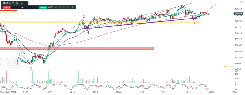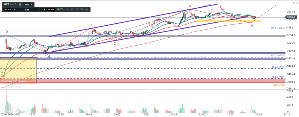 Wczorajsze „osłabienie” wyrysowało na ten moment abc i choć została wybita linia ograniczająca ostatnie wzrosty od dołu, to jednak zatrzymaliśmy się na poziomie dołka. To daje podstawę do tego aby założyć , że niedźwiedzie raczej nie przejmą kontroli. Zgodnie z tym jak porusza się cena w trendzie, powinniśmy teraz, jeśli obrona dołka jest skuteczna, wyjść na nowy szczyt. Moim zdaniem, ten ewentualny nowy szczyt wpisywałby się idealnie w wypełnienie kanału jaki tworzy fala 5, kanału który teraz mógłby być trójkątem rozszerzającym. Bardzo ciekawie wygląda to na tle szerszej perspektywy czasowej i tu można wyciągnąć mocniejsze wnioski na nieco dłuższą perspektywę czasową niż kilka czy kilkanaście godzin sesyjnych. Jednak taka pogłębiona analizę z wnioskami pozostawię sobie do weekendowej.
