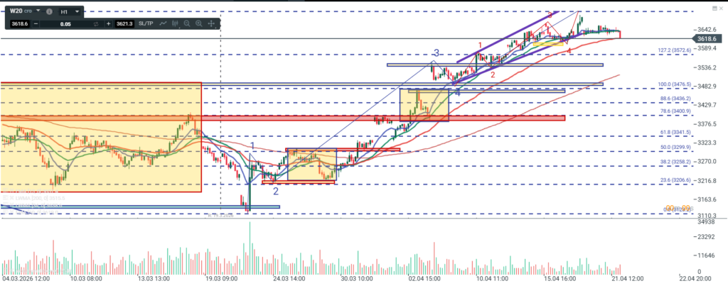Niemal cała wczorajsza sesja to konsolidacja z minimalną zmiennością. Dopiero sama końcówka przyniosła nam wybicie dołem z tej konsolidacji i wejście w realizację scenariusza jaki wczoraj przedstawiałem. Miejsce na dalszy ciąg korekty spadkowej jeszcze jest zatem patrzymy na ok. 3595 dalej ewentualnie na ok. 3550 i jeśli niedźwiedź miałby wsparcie na innych rynkach to ok. 3490.