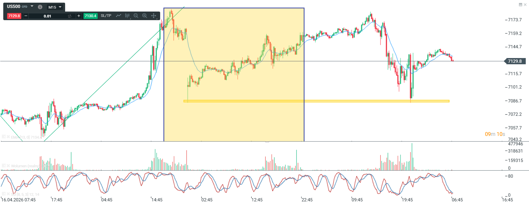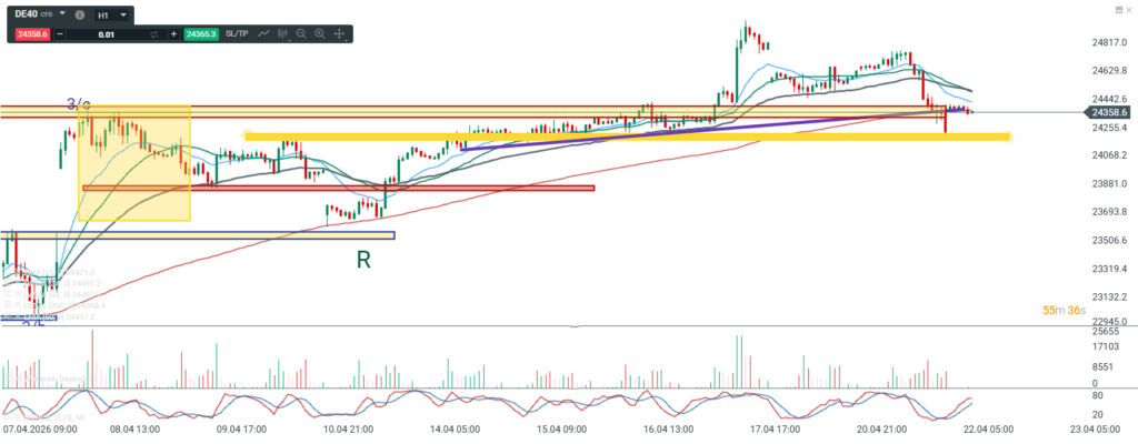 Na wykresie intra kontraktów na DAX mieliśmy kontynuację konsolidacji a następnie zapowiadane wybicie dołem i ruch w kierunku strefy – linii szyi ORGR. Spadek po wybiciu z konsolidacji przyjął formę impulsu, które naruszyło strefę ale już nocne otwarcie powróciło na tę strefę. Jeśli ma zadziałać formacja to powinniśmy dzisiaj podążać w górę choć możliwe jest wykreowanie DB na poziomach wczorajszego minimum.